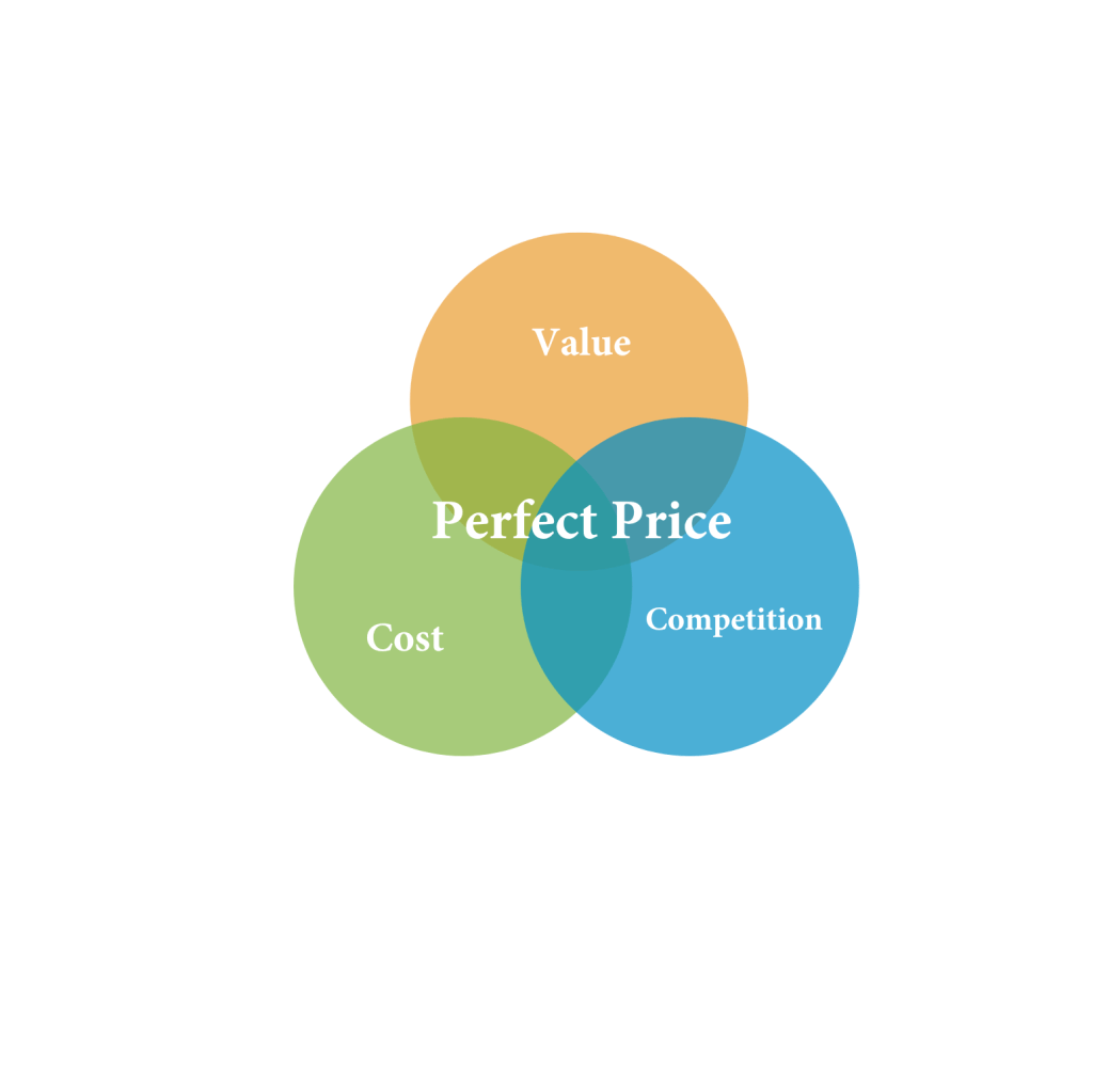 Finally, employ a Venn Diagram-type comparison to find your perfect price. This method involves overlapping circles representing different pricing factors like cost, customer value, and market competition. The intersection of these circles is where your ideal price point lies. Share this pricing analysis with your team, advisors and partners to get their feedback before implementing it. You will be shocked to hear the creative ideas they will offer up.